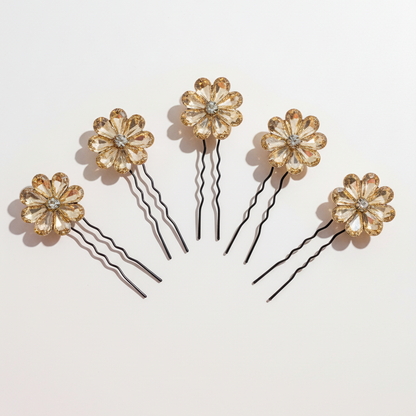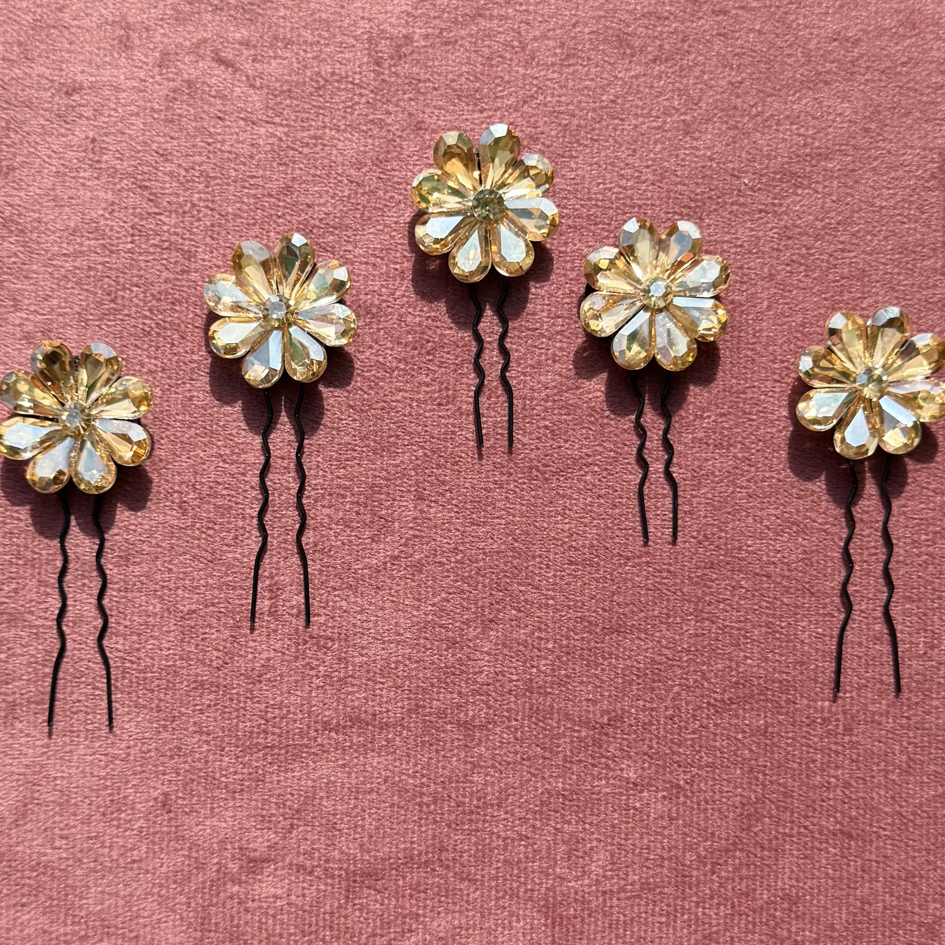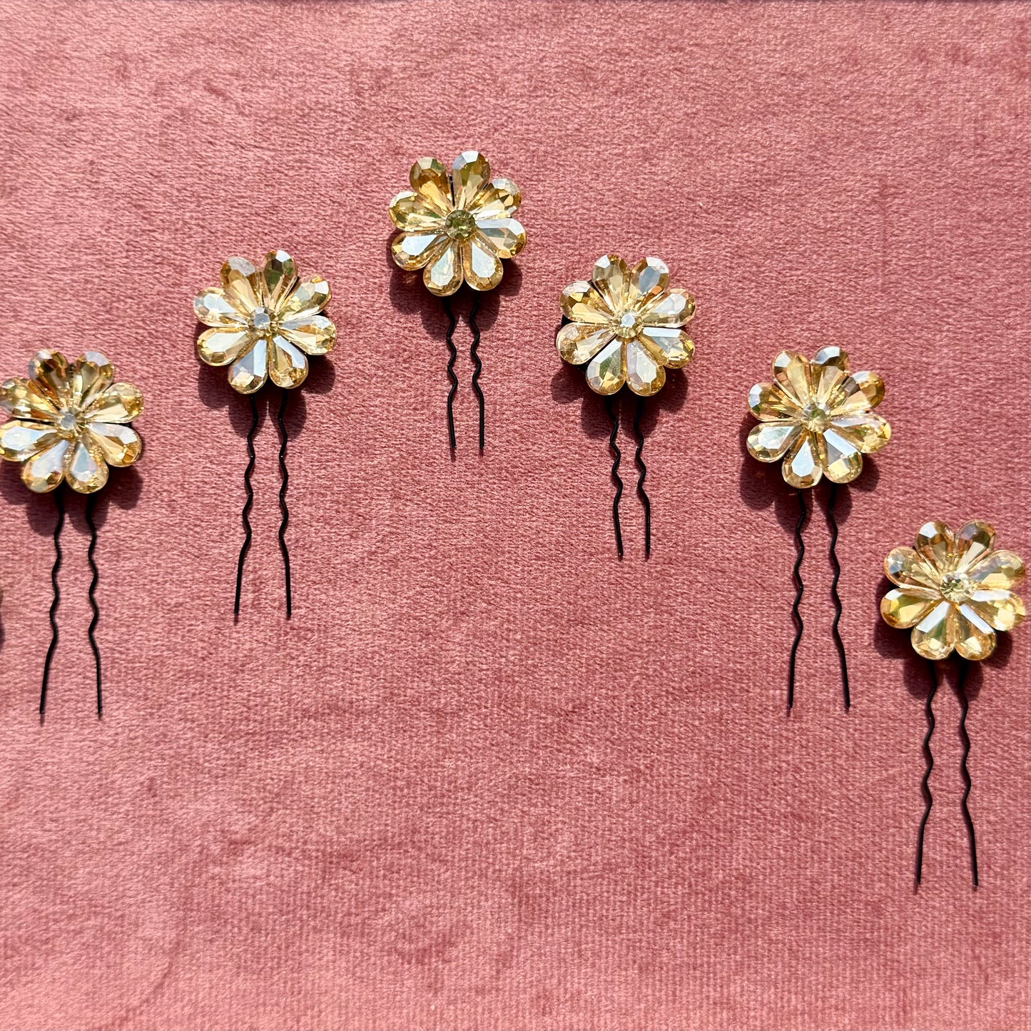 Add a sparkling touch to your hairstyle with this elegant set of golden floral hairpins. Each pin features a beautifully faceted crystal flower that catches the light with every movement. Perfect for brides, bridesmaids, festive occasions, or adding subtle glamour to your everyday look.