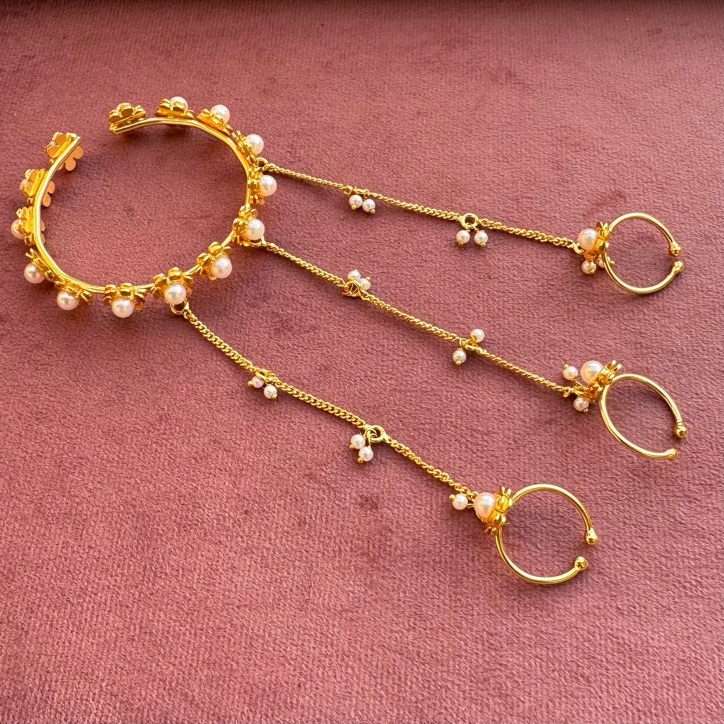 A perfect blend of grace and tradition, this Gold Floral Pearl Haathphool Set is designed to adorn your hands with timeless beauty. Featuring delicate floral motifs with dainty pearl accents, this handcrafted piece connects elegant finger rings to a matching bracelet through fine gold-toned chains. Ideal for brides, bridesmaids, and festive occasions.